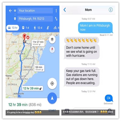 再比如这位小伙伴,本来从佛罗里达去匹兹堡是要搬东西,未曾想到顺便来避难!而他妈妈告诉他人们正在疏散,加油站已空,暂时不要回去。